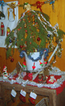 After we went skiing the day that I arrived, Kathy and I set about decorating the house for Christmas. We searched for a box labeled "Christmas" in the quonset hut and when we finally found it, it was empty! I was impressed with a set of caribou antlers we found while searching and decided to take those to the house just in case creative genius struck. It struck Kathy and she set a small potted plant on the brow tine... and the rest just fell into place.
