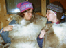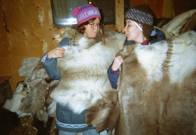 Aunt Kathy and I with caribou skins trying to decide