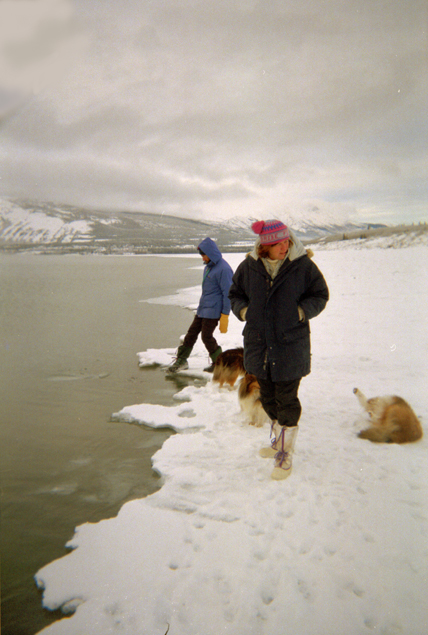 Kathy and Glenn with two shelties walking along the "beach" at Carcross.