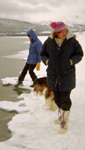 Kathy and Glenn with two shelties walking along the "beach" at Carcross.